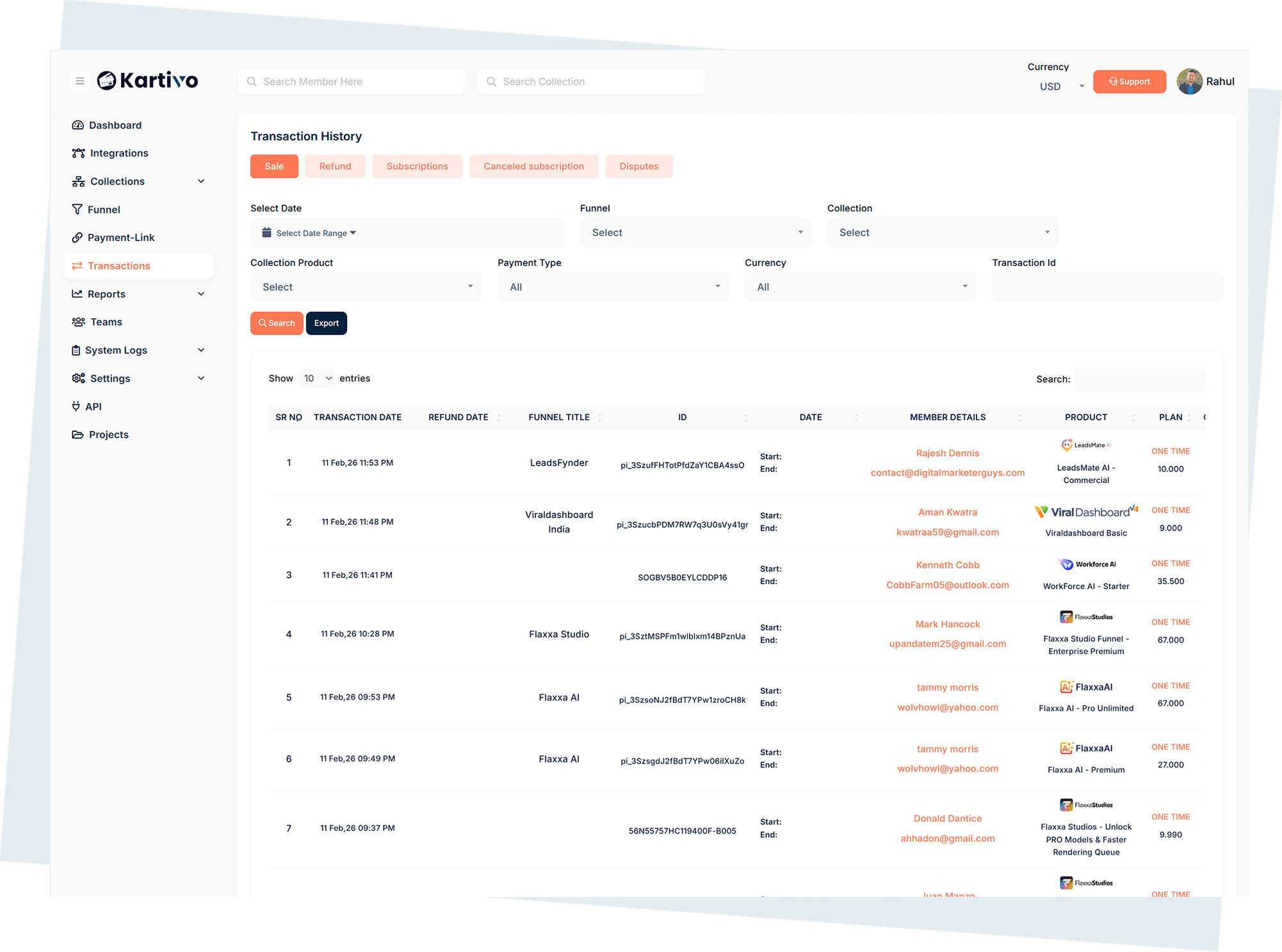 Kartivo unifies transactions from all your payment gateways and marketplaces into a single, searchable dashboard. No more switching between Stripe, PayPal, and JVZoo to find a payment.